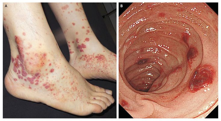 A 38-year-old previously healthy man presented with progressive rash, abdominal pain, arthralgia, and low-grade fever that had lasted for 2 weeks despite treatment with oral prednisolone at a dose of 30 mg per day. Physical examination showed diffuse abdominal tenderness and palpable purpura distal to the knees (Panel A). The white-cell count and C-reactive protein level were elevated (13,600 cells per cubic millimeter [normal range, 3900 to 9000] and 6.5 mg per liter [normal value, <3.0], respectively), but other laboratory tests, including platelet count and urinalysis, were normal. Computed tomography revealed thickening of the duodenal and jejunal walls. Upper gastrointestinal endoscopy showed purpuric lesions in the descending duodenum (Panel B). The duodenal and skin biopsies revealed leukocytoclastic vasculitis with IgA deposition, which is consistent with IgA vasculitis (Henoch–Schönlein purpura). The patient was treated with high-dose glucocorticoids including pulse therapy, which were tapered successfully after cyclosporine was added to the treatment. IgA vasculitis, a systemic small-vessel vasculitis, causes palpable purpura in the lower extremities, abdominal pain, arthralgia, and glomerulonephritis. Gastrointestinal endoscopy may reveal vasculitic lesions that are similar to those observed in cutaneous vasculitis.