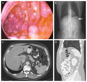 A 63-year-old man presented for a screening colonoscopy. During the colonoscopy, several submucosal polypoid lesions, 3 to 8 mm in diameter, were noted in the splenic flexure. Since the lesions were easily indented with gentle pressure and had a bluish hue, pneumatosis intestinalis was suspected (Panel A). When the lesions were punctured, they became deflated, supporting the diagnosis (see video). Computed tomography revealed multiple air pockets in the intestinal wall at the splenic flexure (Panel B, arrow; Panel C, asterisk; and Panel D) and some free intraperitoneal air (Panel C, arrow). The results of histopathological inspection of an endoscopic-biopsy specimen were consistent with pneumatosis intestinalis. Pneumatosis intestinalis is diagnosed by the presence of air pockets in the intestinal wall. In certain cases, pneumatosis intestinalis may be considered a surrogate marker for intestinal ischemia and impending perforation. However, the condition may also occur in a benign context and is no longer considered a disease but rather a sign, and its significance needs to be considered in accordance with each patient's clinical context. This patient required no specific treatment and has remained asymptomatic. Tomer Adar, M.D. Kalman Paz, M.D. Digestive Diseases Institute, Shaare Zedek Medical Center, Jerusalem, Israel source: nejm.org