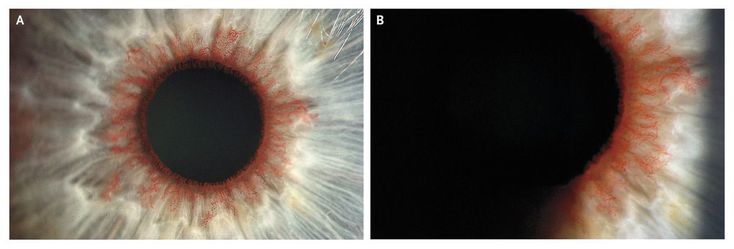 A 74-year-old man with hypertension presented with vision reduced to only light perception in his right eye. A relative afferent pupillary defect was observed, and retinal examination showed an occlusion of the central retinal vein. The abnormal pupillary response was caused by retinal ischemia. A hypoperfused retina exudes angiogenic factors such as vascular endothelial growth factor (VEGF). New vessels formed on the pupil (Panels A and B show low and high magnification, respectively) and also in the angle, the aqueous drainage system that surrounds the iris. Angiogenesis in the angle can occlude the drainage pathway, causing glaucoma and the complication of a painful, sightless eye. Regression of iris neovasculature was achieved with the use of intravitreal anti-VEGF therapy and maintained with the use of scatter laser photocoagulation of the ischemic retina. The patient's vision in the affected eye remained unchanged, and hypertension was the risk factor associated with this ocular vascular occlusion. Owing to the severity of disease at baseline, there was no visual improvement.
