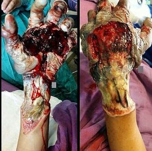 This 16 year old male, managed to expose himself to very high electrical current. In doing so his hand and distal 1/3 of his forearm had to be amputated. This was due to the development of a venous thrombosis. We must learn to be more careful ππ