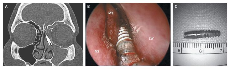 A 57-year-old woman presented with recurrent sinusitis of the left maxillary sinus. Computed tomography showed the presence of a foreign body in the left ethmoid sinus (Panel A). The patient had received an endosseous implant in the upper jaw 2 years earlier without complication. On transoral examination, the implant was unexpectedly absent; the mucosa covering the alveolar process was intact, and the remaining teeth were healthy. During endoscopic surgery, a dental implant in the ostiomeatal complex was visualized (Panel B; LW denotes lateral nasal wall, MT middle turbinate, and NS nasal septum) and extracted (Panel C; units of measurement are centimeters). The patient was discharged the day after surgery, with rapid relief of symptoms. Eight months later, she reported no residual symptoms; on nasal endoscopy, the maxillary sinusotomy was patent with normal mucosa. Displacement of dental implants into the sinus may be the result of improper positioning or the late consequence of periimplantitis and bone resorption.