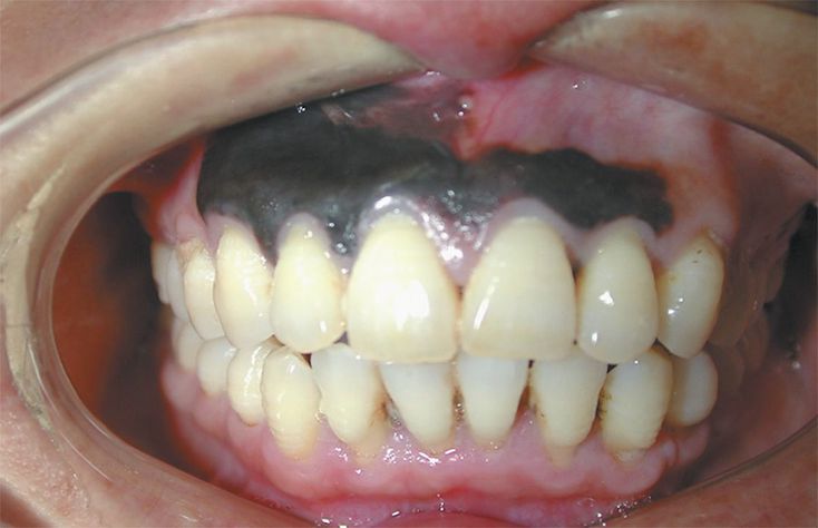 An otherwise healthy 45-year-old man presented with a 4-week history of nonpainful discoloration of the maxillary gingiva. He had no history of pigmented skin lesions. Intraoral examination showed areas of the gingiva that were black. The lesion was a pigmented macule, 1.5 cm by 4 cm in greatest dimension, with asymmetric and irregular borders and colors. Histopathological examination revealed an infiltrating lentiginous melanoma. Oral melanoma is a rare neoplasm. Exposure to the sun is clearly linked to cutaneous melanoma but is not clearly associated with oral melanoma. The patient underwent partial maxillectomy with 2-cm margins, but he declined adjuvant radiotherapy and chemotherapy. No pathologic lymph nodes were found. At follow-up 6 months after surgery, there were no signs of tumor recurrence.