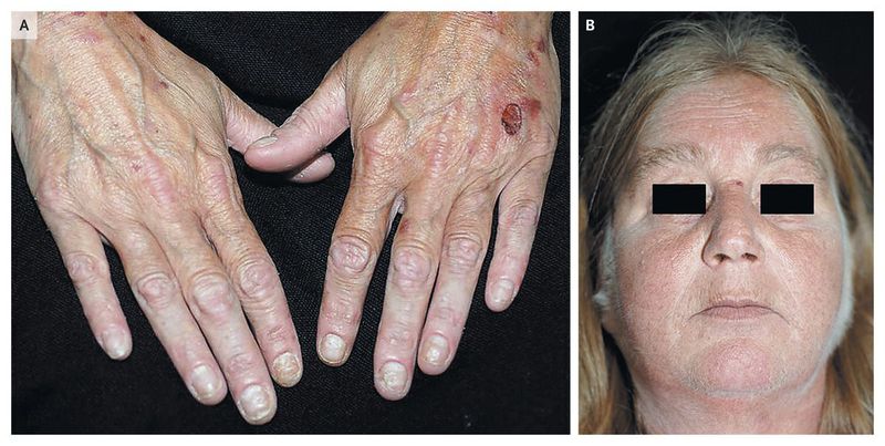 A 54-year-old woman who had had hepatitis C infection for 12 years presented with excess hair on her face, which she had had since the age of 25 years, and new erosions on her hands. On physical examination, several ulcerations, milia, and thickened skin were noted on the dorsal aspect of both hands (Panel A). Excess hair growth (hypertrichosis) was noted in the temporal and malar facial areas (Panel B). Laboratory studies revealed an elevated level of 24-hour urinary porphyrin of 707 μg (851 nmol; normal, <30 μg [36 nmol]). Porphyria cutanea tarda refers to a group of anomalies in which uroporphyrinogen decarboxylase is deficient. Fragility of the skin is noted after sunlight exposure that results in erosions that heal with milia. Patients may also have excess hair growth, urine discoloration, and scleroderma-like plaques. Treatment can include sun avoidance, therapeutic phlebotomy, antimalarial agents, or chelation with deferoxamine. The patient had a good response to phlebotomy.