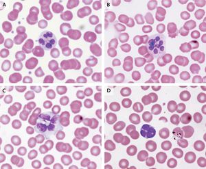A 26-year-old man was found unresponsive at work. When examined by emergency medical service responders, he had a temperature of 41.9°C, a heart rate of 150 beats per minute, unrecordable blood pressure, and a score of 4 on the Glasgow Coma Scale (eyes 1, verbal 2, motor 1; total scores range from 3 to 15, with lower scores indicating reduced levels of consciousness). He was intubated, resuscitated, and cooled. Laboratory tests showed a hemoglobin level of 14 g per deciliter, a white-cell count of 13,700 per cubic millimeter (neutrophils, 8200 per cubic millimeter, with a myeloid left shift), and a platelet count of 172,000 per cubic millimeter. A blood film showed that 90% of neutrophils (Panels A and B), 98% of monocytes (Panel C), and 22% of lymphocytes (Panel D) had unusual nuclear morphologic features. The nuclei showed hypersegmentation, with the segments connected by thin filaments and arranged radially. These morphologic characteristics have been previously described as botryoid nuclei. After obtaining a medical history and a drug screen, we gave the patient a diagnosis of methamphetamine-induced hyperthermia. Botryoid white-cell nuclei are unusual and have been found in patients with hyperthermia. Other causes of hyperthermia in such cases have included heatstroke, hemorrhagic shock and encephalopathy syndrome, autoimmune encephalitis, malignant hyperthermia of anesthesia, and cocaine overdose. The patient had multiorgan failure and required treatment in the intensive care unit, but he ultimately survived his acute illness and was discharged from the hospital. Edward Chew, M.D. Surender Juneja, M.D. Royal Melbourne Hospital, Melbourne, VIC, Australia Source: nejm.org