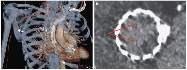 An 84-year-old man had sudden onset of severe pain and weakness in the right arm 7 days after undergoing transcatheter aortic-valve replacement (TAVR) for symptomatic aortic stenosis. Physical examination showed a pale right forearm, nonpalpable right radial and brachial pulses, and reduced strength in the right arm. Three-dimensional computed tomographic angiography revealed an occlusion of the right axillary artery (Panel A, arrow), and a two-dimensional angiogram showed hypoattenuated thickening of the noncoronary and left coronary aortic leaflets (Panel B, arrows). Surgical thrombectomy was performed, and a fresh thrombus was removed. Transesophageal echocardiography that was performed after thrombectomy revealed a thickened noncoronary aortic leaflet but no intracardiac thrombus. The transvalvular gradient was measured at 15 mm Hg, an increase from 8 mm Hg measured after TAVR. After thrombectomy, the pain and weakness in the patient’s right arm resolved. Aspirin and clopidogrel, which had been the dual antiplatelet therapy initiated after TAVR, were discontinued, and treatment with an oral anticoagulant was initiated.