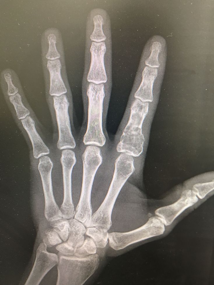 Patient came toE.R .see fracture in proximal phalanx the image take after 20days ,after remove the splint !