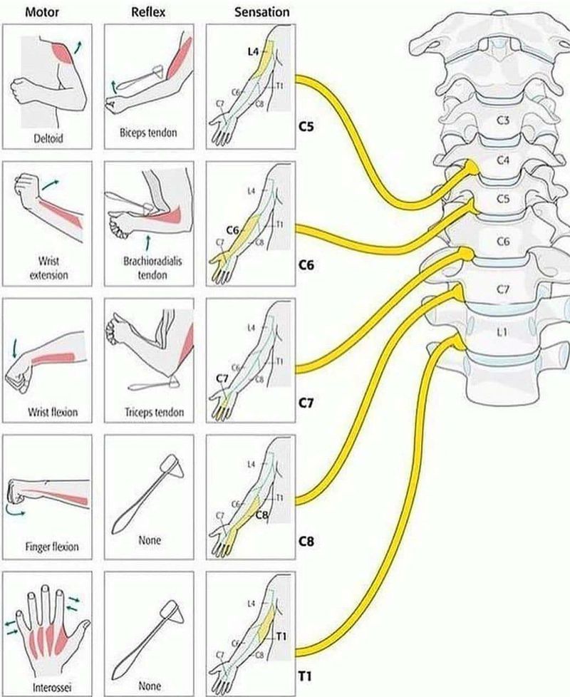 Myotom is a term that refers to a group of muscles innervated by a single spinal nerve root. The human body has multiple myotomes, each corresponding to a specific spinal level. Myotomes are important in assessing muscle strength and evaluating neurological conditions. The concept of myotomes is closely related to dermatomes, which are specific regions of the skin innervated by a single spinal nerve. Both myotomes and dermatomes are used in medical examinations to assess the function of the peripheral nervous system. In neurological examinations, a healthcare provider may test different myotomes by asking the patient to perform specific movements or by applying resistance to certain muscle groups. By assessing the strength and movement of these muscles, doctors can gain insights into the functioning of the corresponding nerve roots and the overall neurological health of the individual. It's worth noting that myotomes are part of a broader neurological assessment and are not used as standalone diagnostic criteria. They provide valuable information along with other clinical findings to help healthcare professionals evaluate and diagnose neurological conditions or injuries.