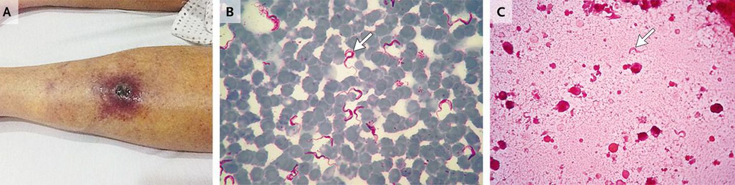 A 65-year-old man was admitted to the hospital with a 4-day history of fever, asthenia, myalgia, and arthralgia. The physical examination revealed two violaceous lesions measuring 3 cm in diameter with shallow ulceration in the lower portions of both legs (Panel A). He reported having been bitten by a tsetse fly during an annual hunting trip in Zambia and had returned to Argentina 10 days before his admission. Microscopical examination of blood (Panel B, arrow) and fluid from one of the lesions (Panel C, arrow) revealed Trypanosoma brucei rhodesiense (T.b. rhodesiense), which causes human African trypanosomiasis (also called sleeping sickness). Tanzania, Malawi, Zambia, and Zimbabwe are typical countries of origin for cases of T.b. rhodesiense human African trypanosomiasis, which may be an acute, life-threatening disease characterized by fever (103 to 105°F [39.4 to 40.6°C]), parasitemia, and chancre. Because of difficulties in obtaining suramin, we initially administered pentamidine and switched to suramin 48 hours later. Subsequently, the patient's condition worsened, and he was admitted to the intensive care unit with the acute respiratory distress syndrome, along with hepatic and renal failure. Mechanical ventilation and hemodialysis were initiated. Disseminated intravascular coagulation developed, and the patient died 3 days later from ventricular arrhythmia.
