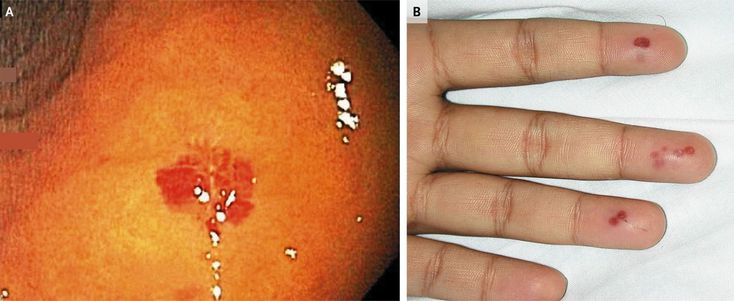 A 24-year-old man was transferred to the hospital for evaluation of jaundice and abdominal pain. He had a lifelong history of severe photosensitivity and wore long-sleeved shirts and sunscreen to limit sunburn. During the evaluation for abdominal pain, an initial upper endoscopy was negative. However, postendoscopy melena prompted a second look, which revealed multiple mucosal burns caused by the light source of the endoscope during the initial procedure (Panel A). Burns also developed on his fingers from the light source of a pulse oximeter (Panel B). A workup revealed elevated red-cell free protoporphyrin levels and elevated levels of porphyrin in the stool and urine. A diagnosis of erythropoietic protoporphyria was confirmed with genetic testing. Burns are caused by photoactivation of protoporphyrin deposits in tissues. This patient also has severe liver disease due to hepatic protoporphyrin deposition. He is being evaluated for combined liver and bone marrow transplantation.