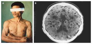 A 42-year-old man presented with seizures and approximately 300 palpable intramuscular cysts, with 54 cysts on his head, face, and neck, 110 on his chest and back, 86 on his arms, and 52 on his legs (Panel A). During the 3 years preceding presentation, he reported having a chronic headache and witnessing the development of intramuscular cystic nodules on his arms and his upper body (measuring 0.5 to 0.7 cm in diameter and 0.5 to 2.0 cm in diameter, respectively). Proglottids could be seen in his feces. A subcutaneous biopsy was performed, and a scolex with suckers and hooklets typical of the tapeworm Taenia solium were detected. A cranial computed tomographic scan was obtained and showed numerous neurocysticercosis cysts (measuring 3 to 5 mm in diameter) in his brain, containing living, dead, calcified, and mummified forms of the parasite (Panel B). The patient was given a single dose of praziquantel on the first day, followed by three rounds of treatment with albendazole administered for 30 days, withheld for 10 days, and then restarted. After 4 months of treatment, his headaches and seizures resolved, and resolution of the cysts could be seen on magnetic resonance imaging. The patient has recovered and has reported having no further seizures. source: nejm.org