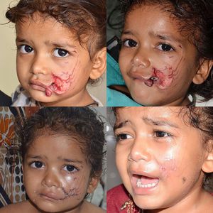 Dog bite!! Viewers discretion is advised A young female child was playing near her home when one of the street dogs bit her in the face. She was referred to plastic surgery for repair. The cheek and upper lip injuries were carefully repaired under surgical loupe magnification. She was vaccinated for rabies along with that. Parents were extremely happy with the outcome of the surgery.