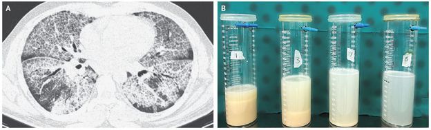 A 34-year-old man with a 20-pack-year smoking history presented to the emergency department with a 4-month history of progressively worsening dyspnea and nonproductive cough. The oxygen saturation was 65% while the patient was breathing ambient air. He appeared to have dyspnea at rest, his fingers and lips were blue, and his fingers showed clubbing. Sounds on auscultation of the lungs were normal. Computed tomography of the chest revealed diffuse ground-glass opacities with interlobular and intralobular septal thickening — a pattern described as crazy paving (Panel A). Bronchoscopy yielded milky-appearing lavage fluid, and pathological testing showed macrophages filled with proteinaceous material that was positive on periodic acid–Schiff staining, as well as large acellular eosinophilic aggregates. These findings confirmed a diagnosis of pulmonary alveolar proteinosis, which is caused by impaired surfactant turnover. Crazy paving is not pathognomonic of pulmonary alveolar proteinosis and can be seen in a number of other conditions, including acute respiratory distress syndrome, lipoid pneumonia, organizing pneumonia, pulmonary hemorrhage, and Pneumocystis jirovecii pneumonia. The patient underwent large-volume lavage of both lungs in sequential procedures, with the use of 15 liters of saline in each lung. Panel B shows, from left to right, the appearance of the lavage fluid from the right lung after the infusion of 1, 3, 5, and 15 liters of saline. At follow-up 6 months later, the patient had substantial improvement in his clinical condition, with oxygen saturation of 92% while he was breathing ambient air.