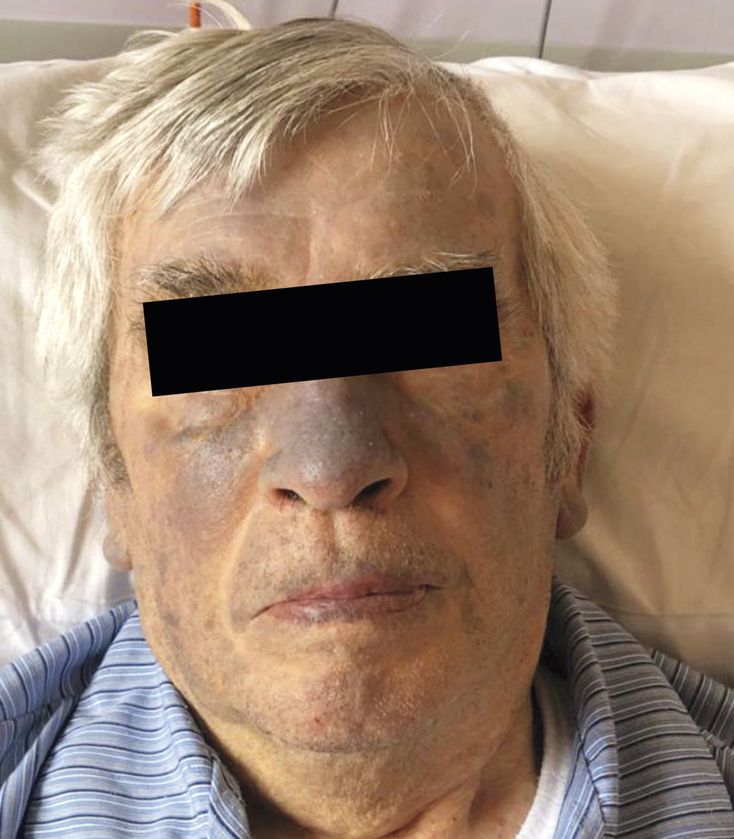 An 81-year-old man with a history of atrial fibrillation and hypertension presented to the emergency department after a fall. His medications were apixaban, ramipril, bisoprolol, amlodipine, and amiodarone. Physical examination revealed blue and gray pigmentation, sometimes referred to as ceruloderma, with discoloration of his nose, cheeks, and forehead and sparing of the deep skin folds. He had no injuries from the fall and reported that this discoloration had been long-standing. An electrocardiogram showed atrial fibrillation with a heart rate of 68 beats per minute. Treatment with amiodarone had been initiated 15 years earlier for an episode of atrial fibrillation with rapid ventricular response. Skin discoloration is an uncommon adverse effect of amiodarone and may abate with cessation of the drug. The fall was attributed to orthostatic hypotension. During the hospitalization, adjustments to the patient’s medications were made, including discontinuation of amiodarone. At a 6-month follow-up visit, the skin discoloration persisted. The patient reported no further falls or any further episodes of atrial fibrillation with rapid ventricular response.