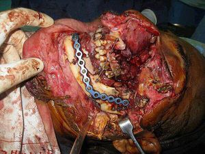 Mandibular reconstruction using a stainless steel reconstruction plate following a traumatic injury to the maxilla and mandible with multiple facial second degree burns. The picture shows a broken lower jaw with a titanium plate with screws over the fractures. A balanced distribution of stress was associated with the plates’ design. This plate modified the mechanical behavior of the fractured region, with less displacement between the fractured segments, holding them in place until complete healing of the bone takes place.