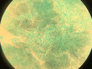 Grocott stain is used to indicate mycosis in a tissue. Its a very common stain, almost used daily, at least weekly. The picture shows a candida infected tonsilla, the backgroud is lightgreen. We use it because it has a good contrast.