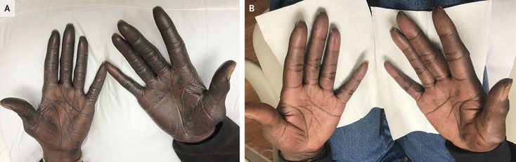 A 57-year-old man with stage 3b colon cancer presented to the medical oncology clinic for adjuvant chemotherapy. Seven weeks earlier, he had undergone a right hemicolectomy, and the pathological examination had revealed moderately differentiated adenocarcinoma, with 2 of 19 pericolonic lymph nodes positive for metastasis. Chemotherapy with FOLFOX (leucovorin [folinic acid], fluorouracil, and oxaliplatin) was initiated. After two cycles, he noted progressive darkening of his palms that was not associated with redness, scaling, or pain. The plantar aspects of his feet were minimally affected, but the remainder of his skin was normal. These findings worsened after a third cycle of chemotherapy (Panel A). In addition to worsening palmar hyperpigmentation, grade 4 neutropenia and grade 3 fatigue developed, and chemotherapy was discontinued. Skin hyperpigmentation is a side effect of various chemotherapy drugs, including fluorouracil; the condition variably improves after treatment is stopped. One month after the patient’s chemotherapy was discontinued, the hyperpigmentation had faded considerably, and by 2 months, his palms had returned to near-baseline appearance (Panel B).