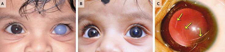 A healthy 3-month-old boy was brought to the emergency department because of the acute onset of corneal edema of the left eye (Panel A). One hour before presentation, his parents noticed that the left cornea was cloudy and the right eye was normal after he had been crying. While the patient was under anesthesia, evaluation revealed severe corneal edema of the left eye. The horizontal corneal diameter was 12 mm in the right eye and 13.5 mm in the left eye (reference range, 10 to 12). Intraocular pressure was 12 mm Hg in the right eye and 32 mm Hg in the left eye. Acute corneal hydrops with infantile glaucoma was diagnosed in the left eye. The boy underwent primary combined trabeculotomy and trabeculectomy in the left eye. Two weeks postoperatively, the left cornea showed dramatic improvement (Panel B). Six months postoperatively, an evaluation showed a clear cornea with Haab's striae (Panel C, arrows), which may affect vision if located centrally, and normal intraocular pressure (10 mm Hg in both eyes). At the last follow-up (2 years postoperatively), there was no corneal edema, the intraocular pressure was 12 mm Hg, and the visual acuity was 20/40 in both eyes.