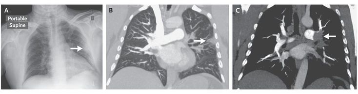 A 46-year-old man presented to the emergency department with the sudden onset of dyspnea, pleuritic chest pain, and hypoxemia. The patient's medical history and family history were unremarkable. An electrocardiogram showed a deep S wave in lead I, a large Q wave in lead III, an inverted T wave in lead III, and an incomplete right bundle-branch block, suggesting right ventricular strain. The patient underwent chest radiography, which revealed a Hampton's hump on the left side of the chest (Panel A, arrow). Computed tomographic pulmonary angiography further defined this area of pulmonary infarction (Panel B, arrow) and revealed bilateral pulmonary emboli, including a thrombus in the left main pulmonary artery (Panel C, arrow). Originally described in 1940 by Hampton and Castleman, Hampton's hump is a peripheral wedge-shaped opacification abutting the pleura, signifying pulmonary infarction distal to a pulmonary embolism. The majority of pulmonary emboli do not result in infarction of the distal lung, presumably because of vascular collateralization. Infarction is most likely to occur in patients with large pulmonary emboli or underlying lung disease. Anticoagulation therapy was initiated, and the patient was discharged home in stable condition.