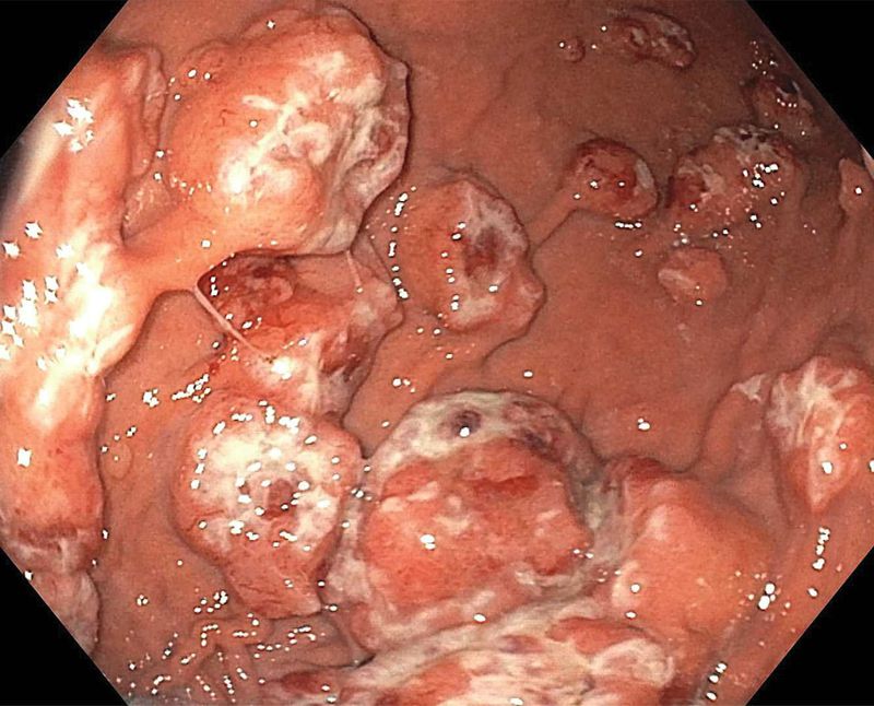 An 85-year-old man presented to the emergency department after losing consciousness and collapsing. He had regained consciousness by the time of presentation and reported a 2-week history of passing dark stools. He had a history of two cancers: breast cancer, for which he was receiving treatment with goserelin and letrozole, and nodular melanoma, for which he had undergone a wide local excision on the right arm and dissection of the axillary lymph nodes 5 months earlier. The heart rate was 110 beats per minute, and the blood pressure was 115/70. He was pale, and there was evidence of ongoing melena with no abdominal tenderness. Laboratory studies showed a hemoglobin level of 7.6 g per deciliter (normal range, 11.5 to 15.5), and he received 1 unit of red cells. Endoscopy revealed multiple polypoid nodules with a central depression and evidence of recent, but not active, bleeding in the stomach. The results of histologic analysis of biopsy samples were consistent with metastatic melanoma. Computed tomography showed thickening of the stomach wall and lining, along with metastases in the brain, lung, and liver. Despite treatment with palliative radiation and pembrolizumab, he presented 3 months later with further episodes of melena as well as multiple other complications. He was transitioned to hospice care and died shortly thereafter.