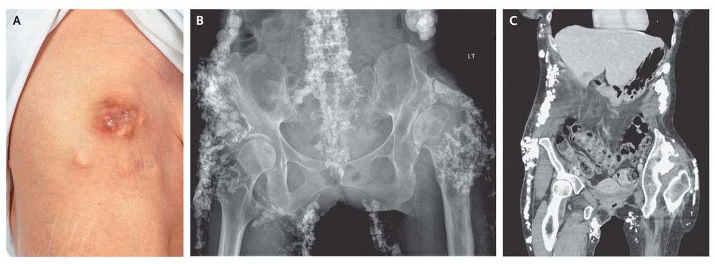 A 41-year-old woman received a diagnosis in 2000 of an overlap syndrome, with limited systemic sclerosis and dermatomyositis. Subcutaneous hard lumps developed over her buttocks and elbows in 2001 and progressed clinically (shown on the inferior axillary area of the right chest wall in Panel A) and radiographically (Panels B and C). The biggest lesions were subsequently excised, but they reappeared within 1 year after surgery. Histologic examination revealed calcified deposits in subcutaneous fibrofatty tissue, findings consistent with a diagnosis of calcinosis cutis. Calcinosis cutis has been reported in cases of systemic sclerosis, dermatomyositis, and mixed connective-tissue disorders. The condition causes substantial complications and can be difficult to treat. Since diagnosis, the patient's treatment has included glucocorticoids, azathioprine, and methotrexate for the connective-tissue disorder and, more specifically, bisphosphonates and minocycline for calcinosis cutis. Despite treatment, the patient has persistent, extensive calcification over her buttocks, shins, and forearms, with recurrent infections at calcified sites.