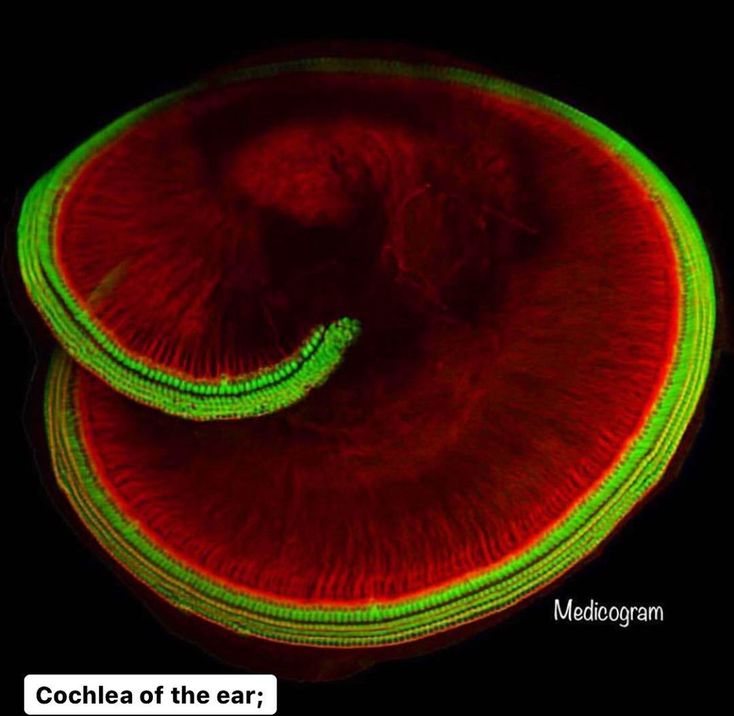 This image shows the 𝐂𝐨𝐜𝐡𝐥𝐞𝐚, as seen through a florescent electron microscope. •Cochlea: Cochlea is the snail-shaped structure in the inner ear coiled around the modiolus, where sound vibrations are converted into nerve impulses by the organ of Corti. Ending a 40-year quest, scientists at Harvard medical school have identified a hearing protein, a critical molecular sensor that converts sound and motion into electrical signals that the brain can sence and understand. Isn't this so awesome?
