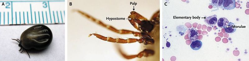 An 80-year-old man presented in November with a 3-week history of malaise, hyperglycemia, and low-grade fevers. Diabetic ketoacidosis was diagnosed. A workup revealed leukopenia, anemia, thrombocytopenia, and elevated aminotransferase levels. At presentation, an engorged tick was removed from the patient's shoulder (Panels A and B). The patient reported that he had recently traveled to and stayed in the town of Mount Kisco, in Westchester County, New York, and he recalled removing a similar tick from his groin while there. Thin and thick blood smears, serologic samples, and polymerase-chain-reaction (PCR) assays were sent for suspected endemic tickborne illnesses, including Lyme disease, babesiosis, anaplasmosis, and ehrlichiosis. Empirical treatment with doxycycline, azithromycin, and atovaquone was initiated. The tick was identified as Ixodes scapularis. A Giemsa-stained peripheral-blood smear revealed neutrophilic intracytoplasmic inclusions (morulae) that were consistent with anaplasmosis (Panel C). PCR results confirmed the presence of Anaplasma phagocytophilum. The patient's response to treatment involved a rise in all cell counts and resolution of diabetic ketoacidosis