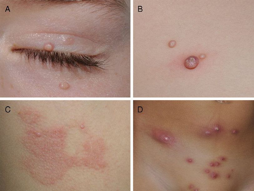 Different clinical manifestations of molluscum contagiosum (MC). A, Pink papules on the eyelids with typical central umbilication. B, Sessile lesion of less typical morphology next to other lesions more characteristic of MC. C, Eczematiform reaction (molluscum dermatitis) surrounding MC lesions. D, Inflamed and abscessed lesions on the abdomen.