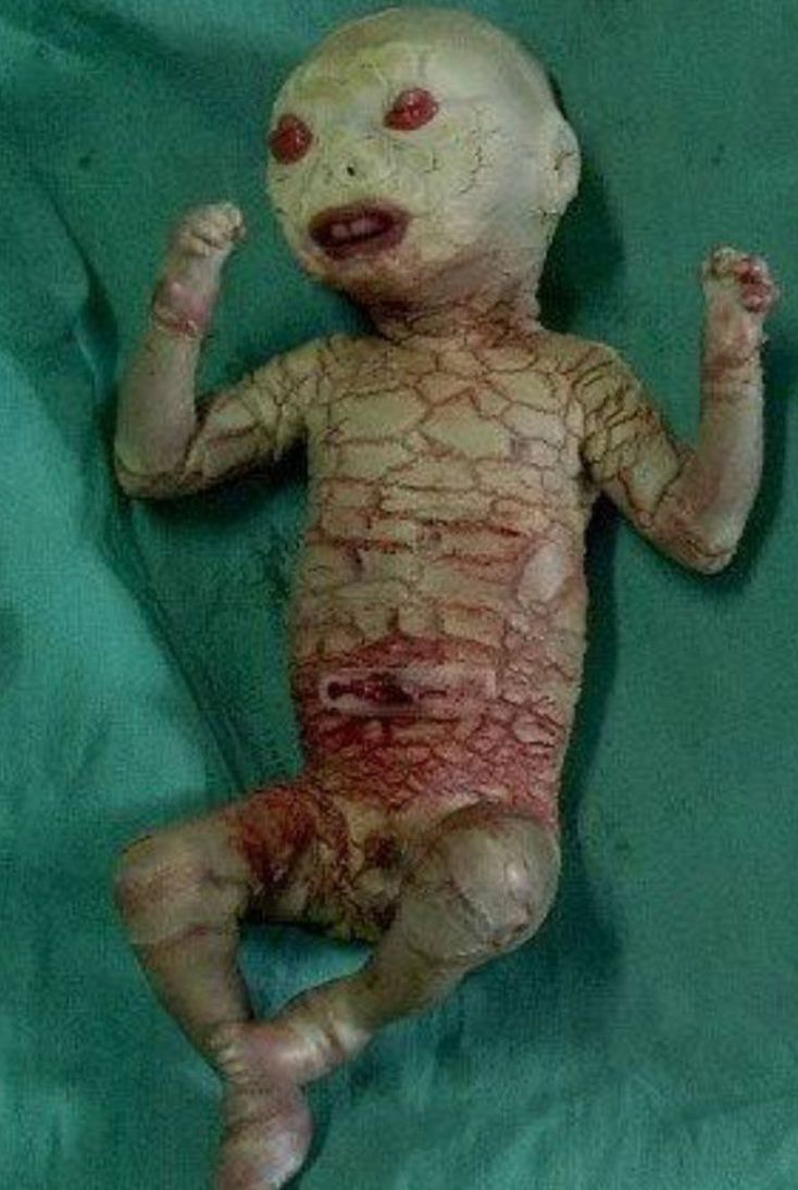 Harlequin ichthyosis is a severe genetic disorder that mainly affects the skin. The newborn infant is covered with plates of thick skin that crack and split apart. The thick plates can pull at and distort facial features and can restrict breathing and eating. Mutations in the ABCA12 gene cause harlequin ichthyosis.