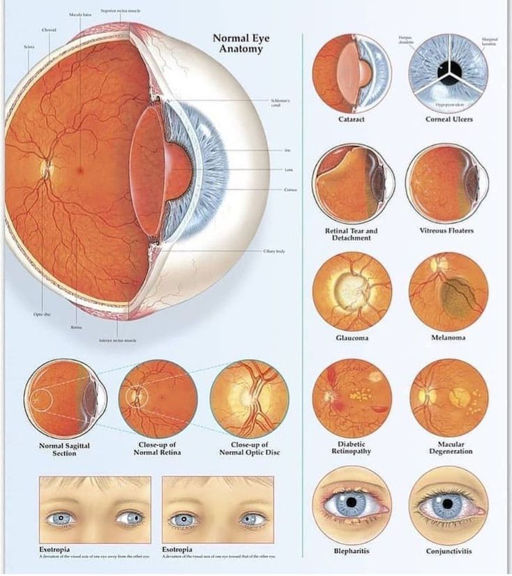 Normal eye anatomy is illustread by a sagittal section of the eyeball ,and close ups of the retina and optic disc .the eye chart illustrates for the conditions and eye problems. 1.Cataracts. 2.corneal ulcers. 3.retinal tear and detachment. 4.vitreous floaters 5.glaucoma melanoma. 6.diabetic retinopathy 7 macular degeneration 8.Blepharitis. 9 .conjunctivitis . 10.Exotropia 11.Exotropia
