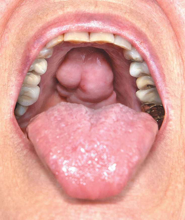 A 70-year-old woman who presented to the clinic for a routine examination was found to have a 6-cm mass on her hard palate. She reported that the mass had been present since birth. Occasionally, she found that the area was hard to clean and that entrapped food gave her halitosis, but otherwise she was asymptomatic. Palatal tori are seen in approximately 20 to 30% of the population and are more common in females than in males. Frequently, these bony outgrowths are incidental findings on routine oral examinations, and there is often considerable variation in clinical appearance. The lesion in this patient was unchanged over a 2-year period of follow-up. Surgical correction was offered, but the patient declined because the lesion was asymptomatic.