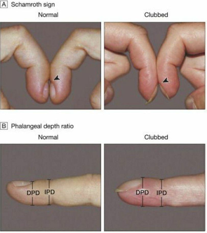To determine if clubbing is present involves use of the “phalangeal depth ratio.” This ratio compares the “distal phalangeal depth” with the “interphalangeal depth”. In normal individuals, the DPD:IPD ratio is <1. ... An angle greater than 190 degrees is considered consistent with clubbing