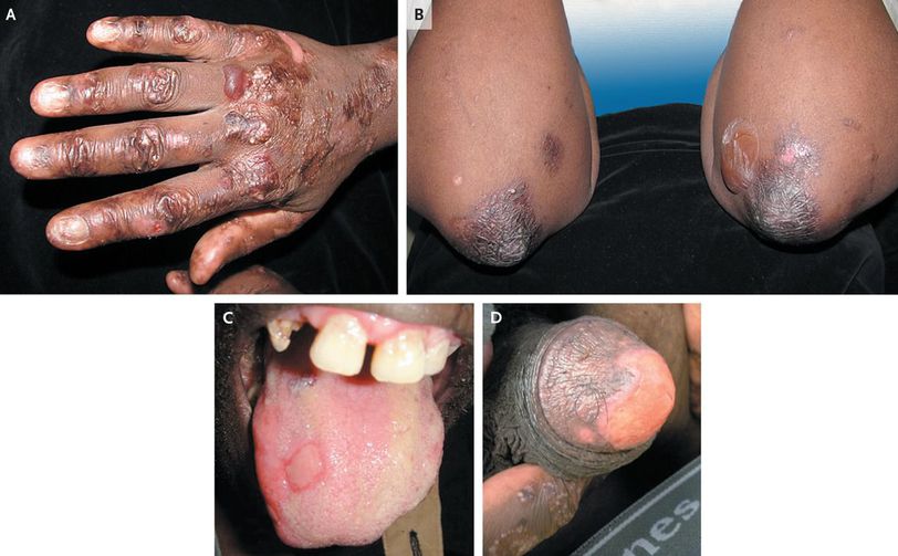 A 50-year-old man presented with tense noninflammatory bullae and erosions on trauma-prone areas of skin (Panels A and B) and the mucosae (Panels C and D). There was also atrophic scarring, milia formation, onychodystrophy, and anonychia. His medical history was remarkable for systemic lupus erythematosus (SLE), lupus nephritis, and hypertension. Examination of a skin-biopsy specimen revealed a cell-poor subepidermal vesicle. Direct immunofluorescence analysis revealed linear deposition of IgG at the dermal–epidermal junction. Studies of salt-split skin, which are used to examine the cutaneous basement-membrane zone for specific autoantibodies, supported the clinical suspicion of epidermolysis bullosa acquisita, an acquired subepidermal blistering disorder with autoantibodies against type VII collagen. This patient presented with the mechanobullous phenotype of epidermolysis bullosa acquisita, characterized by noninflammatory bullae that develop on trauma-prone acral skin and that heal with dyspigmentation, scarring, and milia formation. This autoimmune blistering disorder may mimic porphyria cutanea tarda, is often resistant to treatment, and may be associated with SLE. Treatment with systemic glucocorticoids, mycophenolate mofetil, and rituximab had limited benefit in this patient. Although he had a brief response to treatment with intravenous immune globulins, the administration of cyclophosphamide was started for maintenance of remission. The use of cyclophosphamide has resulted in the decreased formation of new blisters; however, disease activity has persisted.