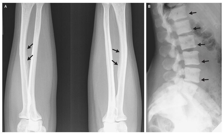 A 47-year-old woman was referred for bone pain and abnormal findings on radiography. The patient reported that for the past 17 years, she has habitually consumed a pitcher of tea made from 100 to 150 tea bags daily (estimated fluoride intake, >20 mg per day). She reported a 5-year history of pain in the lower back, arms, legs, and hips. Because of brittleness, all her teeth had been extracted. Radiography of the forearm revealed interosseous membrane calcifications (Panel A, arrows), and radiography of the spine revealed a rugger-jersey appearance (striated pattern of increased density in the upper and lower zones of the vertebrae) (Panel B, arrows), suggesting skeletal fluorosis. The serum fluoride concentration was 0.43 mg per liter (23 μmol per liter; normal concentration, <0.10 mg per liter [5 μmol per liter]). Skeletal fluorosis is endemic in areas with high concentrations of fluoride in the drinking water, but it is rare in other parts of the world. Brewed tea has one of the highest fluoride contents among beverages in the United States. After appropriate counseling, the patient discontinued tea consumption, with improvement in her symptoms. Since it can take years to deplete skeletal fluoride, we are considering whether to increase bone remodeling with the intermittent use of teriparatide to facilitate the elimination of skeletal fluoride.