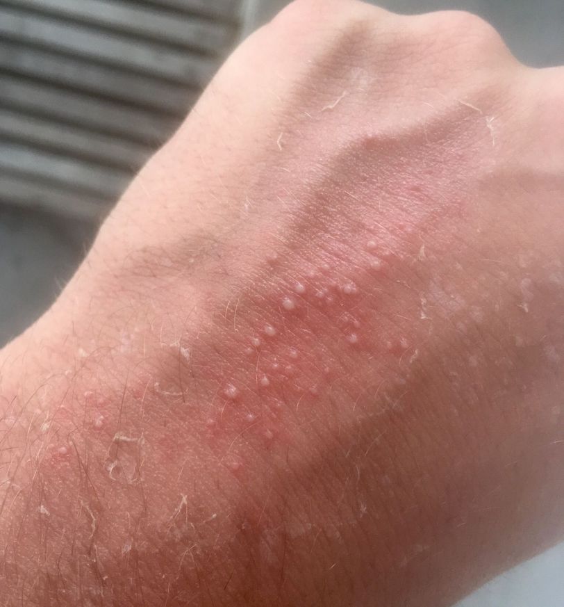 Pt hat a pretty bad sunburn to the dorsal aspect of the left hat. Startet scratching it and presentet with this condition. Whats you diagnosis and method of treatment?