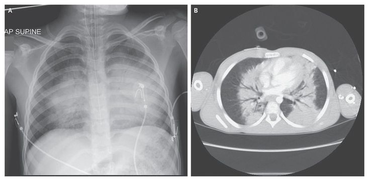 An 8-year-old boy was injured when an improvised explosive device (IED) detonated very close to him. He had multiple wounds to his face, chest, abdomen, legs, and right arm caused by fragments from the IED. He was intubated en route to the hospital owing to airway obstruction and cardiovascular instability. Chest radiography (Panel A) and computed tomography (Panel B) revealed typical appearances of blast lung (pulmonary barotrauma), with interstitial and alveolar filling defects and prominent air bronchograms in a “butterfly” pattern. Lung-protective ventilation was provided with the use of a volume-controlled, pressure-limited mode. The partial pressure of arterial oxygen was normalized with ventilatory support, with a fraction of inspired oxygen of 0.4 to 0.6. Exploratory laparotomy revealed hemoperitoneum and multiple perforations of the small bowel and colon. Two days after the injury, the patient suddenly became hypoxemic and ventilation became extremely difficult. It was discovered that the tube was blocked by a large blood clot caused by pulmonary hemorrhage due to the blast lung. The endotracheal tube was replaced. The patient was successfully extubated after 1 week. On day 19, he was discharged home for palliative care after intestinal failure that was due to multiple small-bowel anastomotic breakdowns attributed to polytrauma and preexisting malnutrition. No further information was available after discharge.