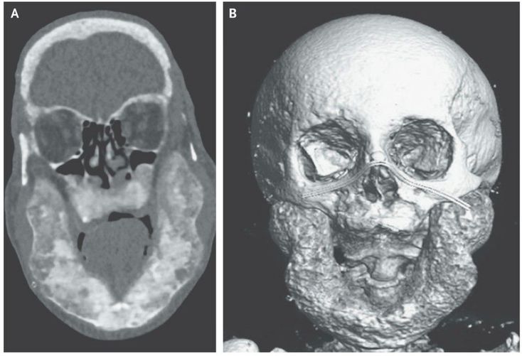 A 48-year-old man who had recently immigrated to France and had not yet established routine medical care presented to the emergency department with shortness of breath. He had a history of end-stage renal disease for which hemodialysis had been initiated 10 years earlier. A physical examination showed mandibular prominence, thoracic kyphosis, and crackles in both lungs. Laboratory studies showed a calcium level of 1.9 mmol per liter (7.6 mg per deciliter) (normal range, 2.2 to 2.6 mmol per liter [8.8 to 10.4 mg per deciliter]), a phosphate level of 0.96 mmol per liter (2.97 mg per deciliter) (normal range, 0.81 to 1.58 mmol per liter [2.51 to 4.89 mg per deciliter]), a 25-hydroxyvitamin D level of 13 nmol per liter (5.2 ng per milliliter) (normal range, 75 to 175 nmol per liter [30 to 70 ng per milliliter]), and a parathyroid hormone level of 4081 ng per liter (normal range, 11.5 to 78.4). Computed tomography (Panel A) and three-dimensional reconstruction (Panel B) of the face revealed mandibular hypertrophy and a heterogeneous appearance of the bone, with both cystic lesions and patches of osteolysis. Similar bony lesions were found in the spine, iliac bone, and femur. Osteitis fibrosa cystica is a skeletal disorder that is caused by sustained hyperparathyroidism, often due to chronic renal failure, resulting in the formation of cystlike tumors in the bone. Treatment with cinacalcet and vitamin D supplementation were started. His shortness of breath resolved after hemodialysis was reinitiated. At a follow-up visit 6 months after treatment was initiated, the parathyroid hormone level had decreased to 1743 ng per liter and the 25-hydroxyvitamin D level had returned to a normal level, but the bone lesions had not regressed