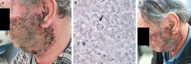 A 65-year-old man presented with a 10-month history of a Large expanding facial plaque that was unresponsive to topical and oral antibiotics administered for abscess and folliculitis, as diagnosed on cutaneous biopsy. Previous pulmonary imaging had revealed a pleural effusion and a mass in the lingula; subsequent lung biopsy was inconclusive for tuberculosis. Although results on tuberculin skin testing and cultures were negative, the patient was started on antituberculosis therapy without improvement. Eight months later, the physical examination revealed a plaque on the left side of the face suggestive of a fungal infection (Panel A). Microscopical examination of cutaneous scrapings with potassium hydroxide showed broad-based budding yeast consistent with blastomycosis (Panel B, arrow). There were no pulmonary symptoms, and chest radiography showed no active disease; the mass in the lingula was unchanged. The patient was started on itraconazole pending the results of skin biopsy, which revealed pseudoepitheliomatous hyperplasia with neutrophilic abscesses and a few yeast. Fungal culture confirmed the presence of Blastomyces dermatitidis. At 1-month follow-up, the patient had clinical improvement (Panel C).