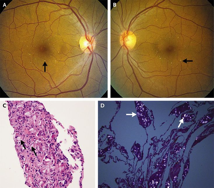A 56-year-old woman who had undergone bilateral lung transplantation for chronic obstructive pulmonary disease was found to have fine crystals in the inner retina in the macula of each eye (Panels A and B, arrows), although she was asymptomatic. The crystals were consistent with talc retinopathy, and a remote history of long-term intravenous drug use was confirmed. Talc is an inert filler in methylphenidate hydrochloride tablets, which are crushed for intravenous drug use. The talc is then unknowingly injected intravenously. Talc particles are usually fine and are distributed intravascularly and extravascularly in the retina in patients who chronically use intravenous drugs and in whom right-to-left cardiopulmonary shunting occurs through collateral vessels that may develop around sites of pulmonary infarction. However, in a patient with a patent foramen ovale, larger particles may cause retinal artery occlusions and severe vision loss. Review of this patient's previous lung-biopsy specimens revealed interstitial epithelioid granulomas with foreign bodies (Panel C, arrows), giant cells, and abundant polarizable crystalline material typical of talc (Panel D, arrows). The talc particles, although perhaps not the primary cause of the respiratory failure, most likely contributed to chronic lung inflammation and exacerbated the patient's condition.