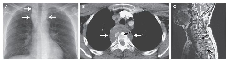 A 20-year-old man who was originally from Bangladesh presented to our clinic with a 6-month history of anorexia and weight loss. The physical examination was remarkable for a temperature of 39°C. Chest radiography showed a mass that appeared to be located in the posterior mediastinum (Panel A, white arrows). Computed tomography (CT) of the chest showed a paravertebral mass of soft tissue surrounding the vertebra (Panel B, white arrows), with destruction of vertebral bodies (black arrow). The mass extended from T1 to T5. Magnetic resonance imaging revealed compression and posterior displacement of the spinal cord without infiltration from the mass (Panel C, arrows). A specimen of the mass was obtained with CT-guided aspiration. The results of Ziehl–Neelsen staining of the tissue were positive, and Mycobacterium tuberculosis grew in a culture of the tissue, indicating Pott's disease. Antituberculous chemotherapy was prescribed. Subsequent radiographic studies showed that the mass had regressed, and the patient's clinical symptoms resolved within 3 months.