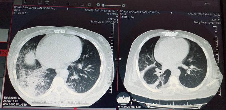 A 65 year old male with dyspnea and non productive cought and fever and chilling has been admitted with COVID 19 pneumonia. Here is the chest ct scan before and after treatment.