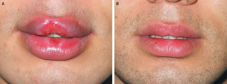 A 25-year-old man with no major medical conditions presented with a 2-month history of two painless ulcerated lesions in the midline of the lower and upper lips (Panel A). The round ulcers measured 0.8 cm to 2.4 cm in diameter with clean, smooth bases and slightly elevated, indurated borders. The patient also reported a 1-week history of symmetrically distributed nonpruritic macules on his trunk and limbs. Testing for the human immunodeficiency virus was negative. The patient reported having had unprotected orogenital sex with his girlfriend about 2 weeks before the onset of the ulcers. The physical examination revealed nontender, bilateral submandibular lymphadenopathy. Rapid plasma reagin testing was positive with a titer of at least 1:32. In addition, a Treponema pallidum particle agglutination assay was strongly positive, and a fluorescent treponemal antibody absorption test was positive for both IgG and IgM antibodies. The patient's girlfriend also had positive results on serologic analyses for syphilis, and both were treated with intramuscular penicillin. The lesions completely resolved during a 4-week period (Panel B).
