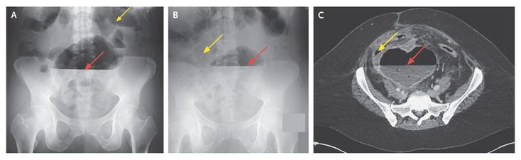 A 44-year-old woman with a history of Crohn's disease presented with a 1-week history of progressive abdominal distention, nausea, and feculent vomiting and reported having lost 13.6 kg during the preceding 6 months. She had undergone ileocecostomy 20 years earlier and had been treated with infliximab for 10 years before the current presentation. On presentation, the patient was afebrile and normotensive. An abdominal examination revealed normal bowel sounds and infraumbilical tenderness, without rebound. Laboratory tests showed a normal leukocyte count, but the erythrocyte sedimentation rate and the level of C-reactive protein were elevated, at 67 mm per hour and 121 mg per liter, respectively. Abdominal radiographs showed gaseous distention of multiple small bowel loops (Panels A and B, yellow arrows) and a larger air collection in the middle-to-lower abdomen, where a long air–fluid level (red arrows) could be seen on upright images. Computed tomographic enterography was performed to further investigate these findings and revealed a mesenteric abscess measuring 9 cm by 10 cm by 18 cm that was filled with air and fluid (Panel C, red arrow) and was displacing small bowel loops (yellow arrow). The patient underwent percutaneous drainage and was given antibiotics intravenously and ultimately underwent complete proctocolectomy with end ileostomy. After surgery, biologic therapy was reinitiated, with good clinical results.