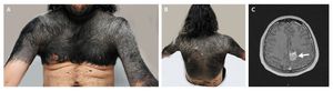 A 29-year-old man presented with headache and numbness in his right face and right upper extremity. He had a large congenital melanocytic nevus involving the chest, upper extremities, neck, and lower part of his face (Panels A and B). He also had multiple, small, satellite nevi that had been present since childhood on other parts of his body. Magnetic resonance imaging of the head with gadolinium showed a homogeneously enhancing tumor of the medial left frontoparietal lobe (Panel C, arrow). The patient subsequently underwent craniotomy with tumor removal. Histopathological analysis of the resected mass showed a melanocytic neoplasm of intermediate grade. Seizures and worsening of metastasis in the brain and gallbladder subsequently developed. The patient underwent gamma-knife radiosurgery and chemotherapy and was receiving palliative hospice care 48 months after the diagnosis of brain metastasis. Patients with large congenital melanocytic nevi are at increased risk for melanoma and neurocutaneous melanosis. Because of its malignant potential, surgical removal of such lesions in childhood should be considered. Venu Gopala Reddy Gangireddy, M.D. Teresa Coleman, M.D. Georgia Regents University, Augusta, GA source: nejm.org