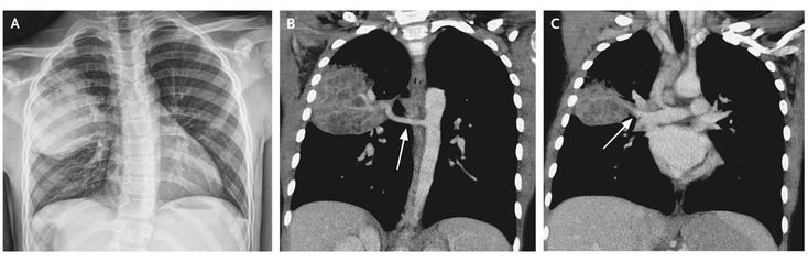 A 9-year-old boy with a history of a lung lesion suspected to be a pulmonary sequestration or a congenital cystic adenomatoid malformation presented to the emergency department with fever and chest pain. A chest radiograph (Panel A) showed a large opacity in the right lung, abutting the minor fissure and displacing it downward. Computed tomography of the chest revealed a large heterogeneous mass with scattered areas of low attenuation, suggesting mucous impaction, and a single large systemic artery (Panel B, arrow) providing vascular supply from the descending aorta. No air bronchograms were evident within the mass. A vein arising from the posterior portion of the mass drained into the right superior pulmonary vein (Panel C, arrow). The patient underwent a right upper lobectomy. Pulmonary sequestration is a congenital disorder characterized by anomalous lung tissue that lacks normal communication with the tracheobronchial tree, which increases the likelihood of infection. The patient recovered without complications and since the operation has had no further pulmonary problems.