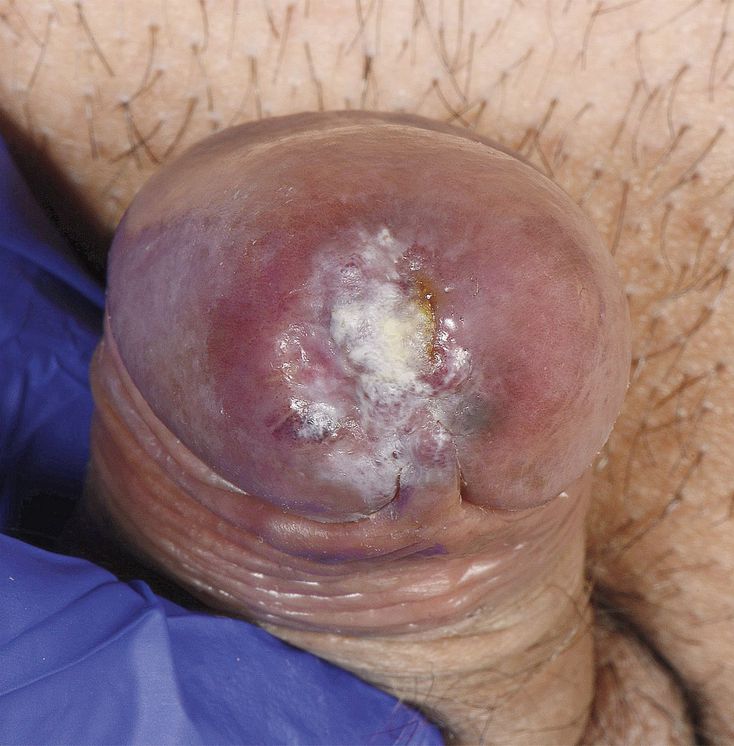 A 49-year-old man with human immunodeficiency virus (HIV) infection presented to the HIV clinic with a several-week history of multiple slow-growing, violaceous, ulcerated lesions on the glans penis and external urethral meatus. He was sexually active with male partners and had not taken prescribed antiretroviral therapy for 2 years. Laboratory studies showed a CD4 cell count of 48 per cubic millimeter (normal range, 500 to 1200) and an HIV viral load of 395,913 copies per milliliter. Tests for herpes simplex virus infection, syphilis, gonorrhea, and chlamydia were negative. An incisional biopsy was performed, and a diagnosis of Kaposi’s sarcoma was made. Computed tomography of the chest, abdomen, and pelvis did not show any extracutaneous involvement. Kaposi’s sarcoma is a cancer caused by human herpesvirus 8, typically in the context of immunodeficiency. With treatment, the patient’s penile lesions resolved completely.