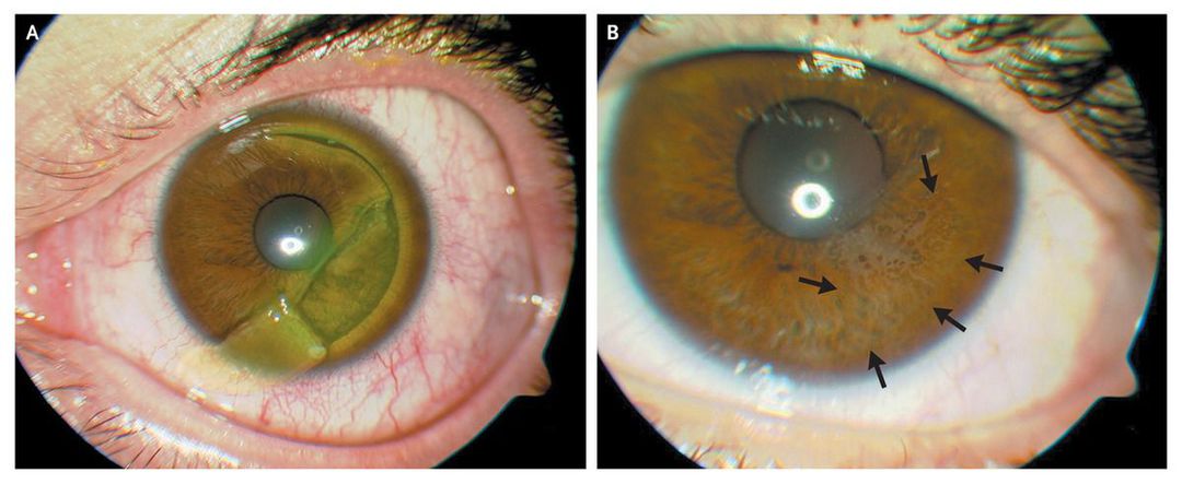 A 29-year-old man presented with blurred vision, photophobia, and pain after trauma to his left eye caused by a screwdriver. He had a history of moderate myopia (visual acuity, 20/25) and had undergone uneventful bilateral laser-assisted in situ keratomileusis (LASIK) 10 years previously. On examination, he had a 180-degree traumatic corneal flap dislocation with an inverted tear in the temporal cornea (Panel A, fluorescein dye). After repositioning of the flap, a disposable contact lens, used as a therapeutic bandage, was placed on the cornea. Topical antibiotics and glucocorticoids were administered. One month postoperatively, his previous visual acuity had recovered and the dislodged flap showed an epithelial ingrowth (Panel B, arrows), which did not require removal. LASIK is a commonly performed type of refractive surgery. Postoperative flap dislocations occur in approximately 1% of patients, usually within the first 24 hours after surgery. Late flap dehiscence due to trauma is a rare complication and suggests that the interface between the flap and the stromal bed is a potential zone of weakness for many years after the procedure.