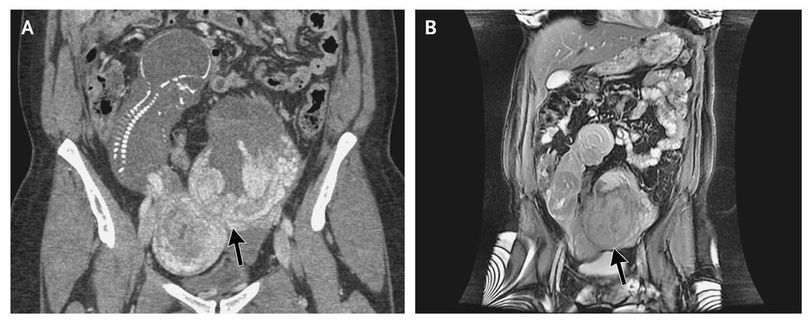 A 30-year-old woman who had a history of two pregnancies and one birth presented with an uncomplicated pregnancy until routine ultrasonography at 19 weeks revealed severe oligohydramnios and a fetus that appeared to be extrauterine. Computed tomography (Panel A) and magnetic resonance imaging (Panel B) of the abdomen and pelvis confirmed an abdominal ectopic pregnancy, with no uterine wall visible surrounding the pregnancy. The fetus was visualized in the right abdomen with a crown-to-rump length of 14 cm, with the placenta attached to the serosa of the uterine fundus (Panel A, arrow). No amniotic fluid surrounded the fetus. The pregnancy was terminated, and surgical removal of the fetus was performed. An abdominal pregnancy refers to a pregnancy that has implanted in the peritoneal cavity, external to the uterine cavity and fallopian tubes. In contrast to tubal ectopic pregnancies, abdominal pregnancies may go undetected until an advanced gestational age. Abdominal pregnancies are associated with a high rate of maternal complications.
