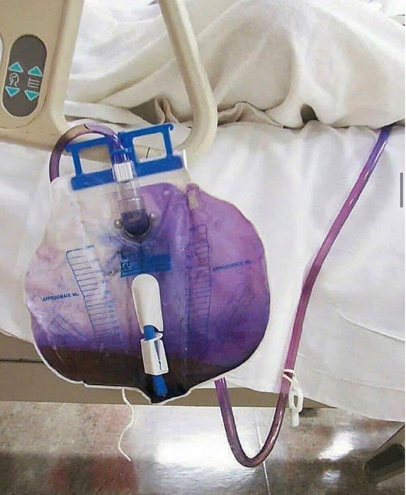 An unbelievable case of purple urine!! A 76-year-old male nursing home resident with dementia and end-stage renal disease who was undergoing hemodialysis was admitted to the hospital after a #syncopal episode that occurred during dialysis. Torsades de pointes was noted on telemetry monitoring. When a urinary catheter was placed, purple urine was drained. The patient had no fever, lower urinary tract symptoms, or #leukocytosis. The urinalysis showed a pH of 9.0 and bacteriuria but no hematuria or pyuria. The urine culture showed 105 colony-forming units or more per milliliter for both Pseudomonas aeruginosa and enterococcus species. Over the next 3 days, the urine gradually became yellow and clear, in the absence of antibiotic treatment. Purple #discoloration can occur in alkaline urine as a result of the degradation of indoxyl sulfate (indican), a metabolite of dietary #tryptophan, into indigo (which is blue) and indirubin (which is red) by #bacteria such as Providencia stuartii, Klebsiella pneumoniae, P. aeruginosa, Escherichia coli, and enterococcus species. The clinical course is benign, and the #urine typically clears with resolution of the bacteriuria and #acidification of the urine. This patient had no further episodes of torsades de pointes and returned to the nursing home in stable condition.
