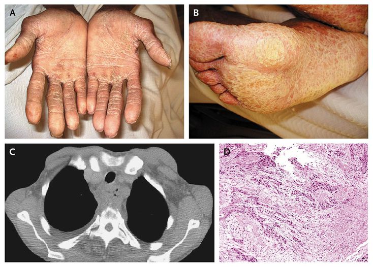 A 55-year-old man presented with a 1-year history of dysphagia. He also reported a 6.8-kg (15-lb) weight loss, anorexia, and progressive hoarseness over the previous 6 months. He had no known medical conditions and did not take any medications. His family history was notable for esophageal cancer in his father and paternal uncle. Physical examination of the head and neck revealed no oral leukoplakia, mass, lymphadenopathy, or tenderness on palpation. Examination of the hands and feet revealed digital clubbing along with palmoplantar keratoderma, findings that are consistent with tylosis (Panels A and B). His father had had similar skin changes on his palmoplantar surfaces. Computed tomography of the chest showed a circumferential mass involving the proximal esophagus (Panel C). Upper endoscopy showed a large ulcerated mass in the upper third of the esophagus that spanned 10 cm and was partially obstructive. Pathological examination revealed invasive, poorly differentiated squamous-cell carcinoma (Panel D; hematoxylin and eosin stain). Tylosis and squamous-cell carcinoma of the esophagus can be observed in hereditary conditions such as the Howell–Evans syndrome. Unfortunately, the patient's condition deteriorated during his hospitalization, and he died from an aspiration event before further testing could be pursued.