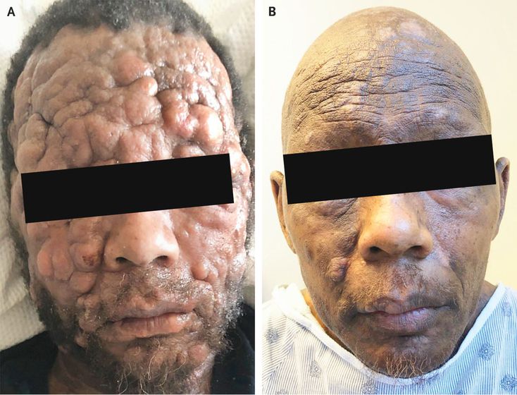 A 53-year-old man with a history of treated stage 1A mycosis fungoides that had been diagnosed 7 years earlier presented with a 2-month history of new and rapidly progressing lesions on his face and body. Examination of the head and neck showed multiple coalescing subcutaneous nodular lesions and deep furrowing of skin folds that resulted in distortion of the patient’s facial features (Panel A). Also present were numerous hyperpigmented erythematous nodules, as well as crusted hyperkeratotic tumors affecting approximately 85% of the patient’s total body-surface area. Flow cytometry of the peripheral blood identified a small population of atypical lymphocytes, and positron-emission tomography showed increased fluorodeoxyglucose uptake in the cervical, axillary, and pelvic lymph nodes, as well as in the spleen and liver. A skin biopsy confirmed the diagnosis of mycosis fungoides with CD30-expressing large-cell transformation. The patient began a regimen of brentuximab, cyclophosphamide, doxorubicin, and prednisone, and notable improvement was seen after two cycles (Panel B).